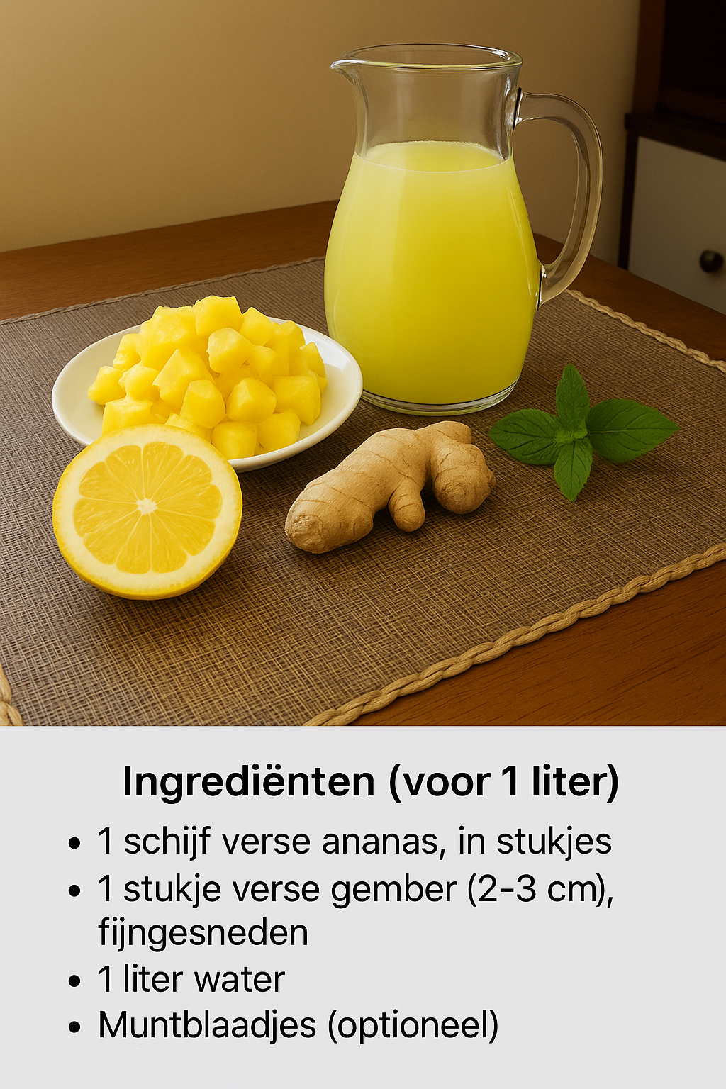 Verwen uzelf met dit **zelfgemaakte ananas-gemberwater met munt**, waarin de frisheid van verse ananas samenkomen met de pittigheid van gember tot een licht, maar krachtig werkzaam drankje dat uw stofwisseling aanwakkert en gifstoffen uit uw lichaam spoelt. Gemaakt zonder suiker maar vol smaak en gezondheidswinst, is dit gerecht perfect als ochtendstart, verfrissing tussen maaltijden door of onderdeel van een gezond welzijnplan.