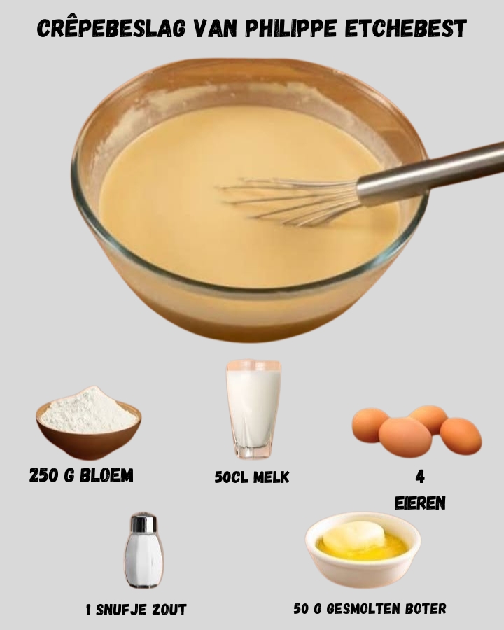 Verwen uzelf met deze **zelfgemaakte pannenkoeken volgens het recept van Philippe EtcheBest**, waarin de delicate balans van bloem, eieren en melk samenkomen tot een lichte, maar verzadigende traktatie die thuis eenvoudig na te maken is. Gemaakt zonder complexe stappen maar rijk aan sfeer en smaak, is dit gerecht perfect als ochtendritueel, twist op klassiek ontbijt of luxe snack.