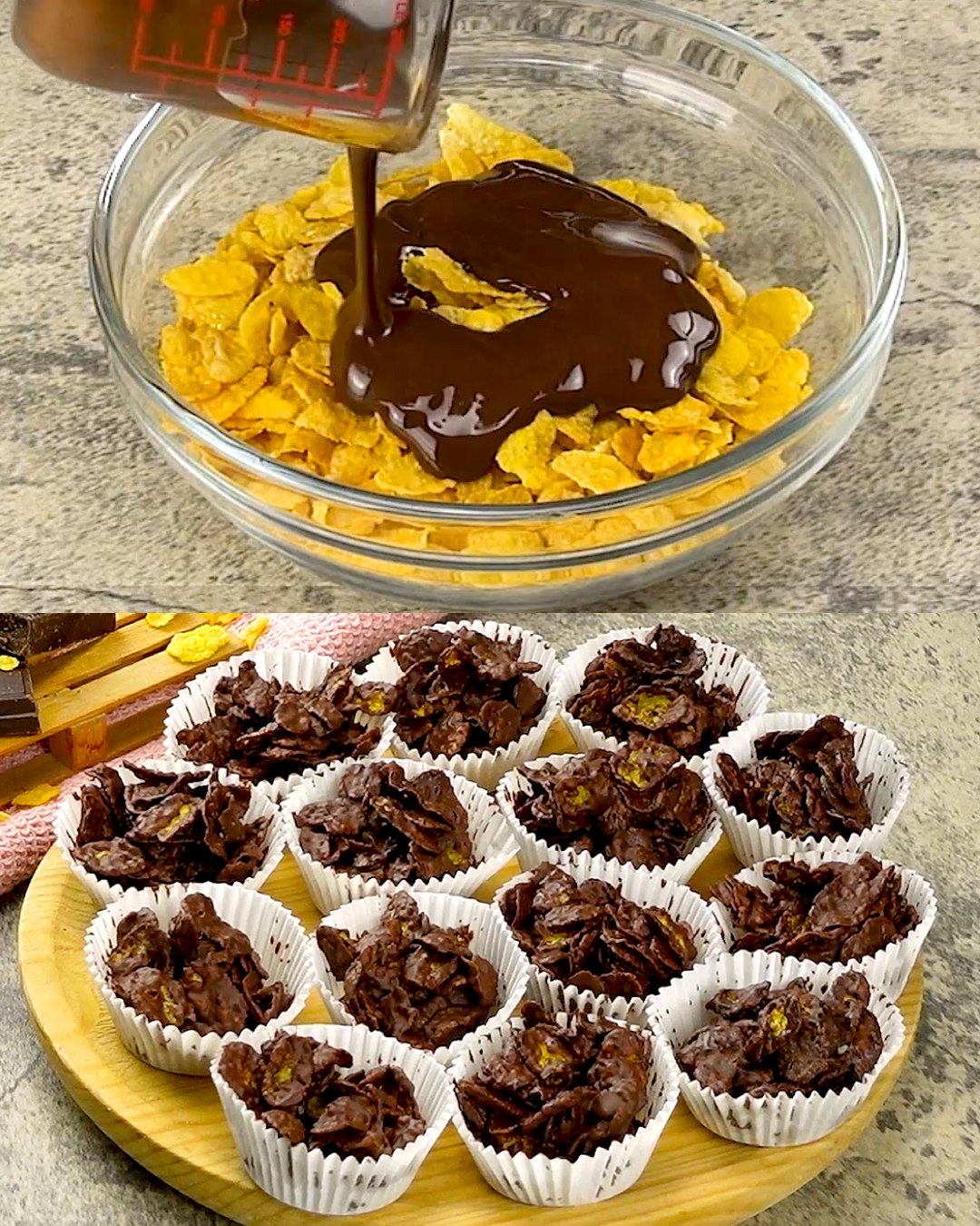 Om ze te bereiden, bedekt u de cornflakes eenvoudigweg met gesmolten pure chocolade en laat u ze hard worden. Zin in een variatie? Bekijk hieronder onze tips om het recept aan te passen en nog smaakvollere combinaties te maken! Ze zijn ook perfect voor kinderen: laat ze hun eigen cornflakes maken als traktatie of om in hun lunchbox te doen. Ze zijn ook perfect voor een feestje of gewoon als tussendoortje na school. Geef de oven even rust en maak deze cornflakecakes – de perfecte traktatie voor een luie middag zonder bakken!