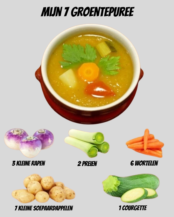 Verwen uzelf met deze **zelfgemaakte 7-groentensoep**, waarin de kracht van verse groenten samenkomen tot een romige, verzadigende basis die uw lichaam én geest verwarmt. Gemaakt met wortelen, courgette, raapjes, prei, tomaten, ui en selderij is dit gerecht perfect als gezonde maaltijd, troostrijke warme hap of onderdeel van een detoxdieet.