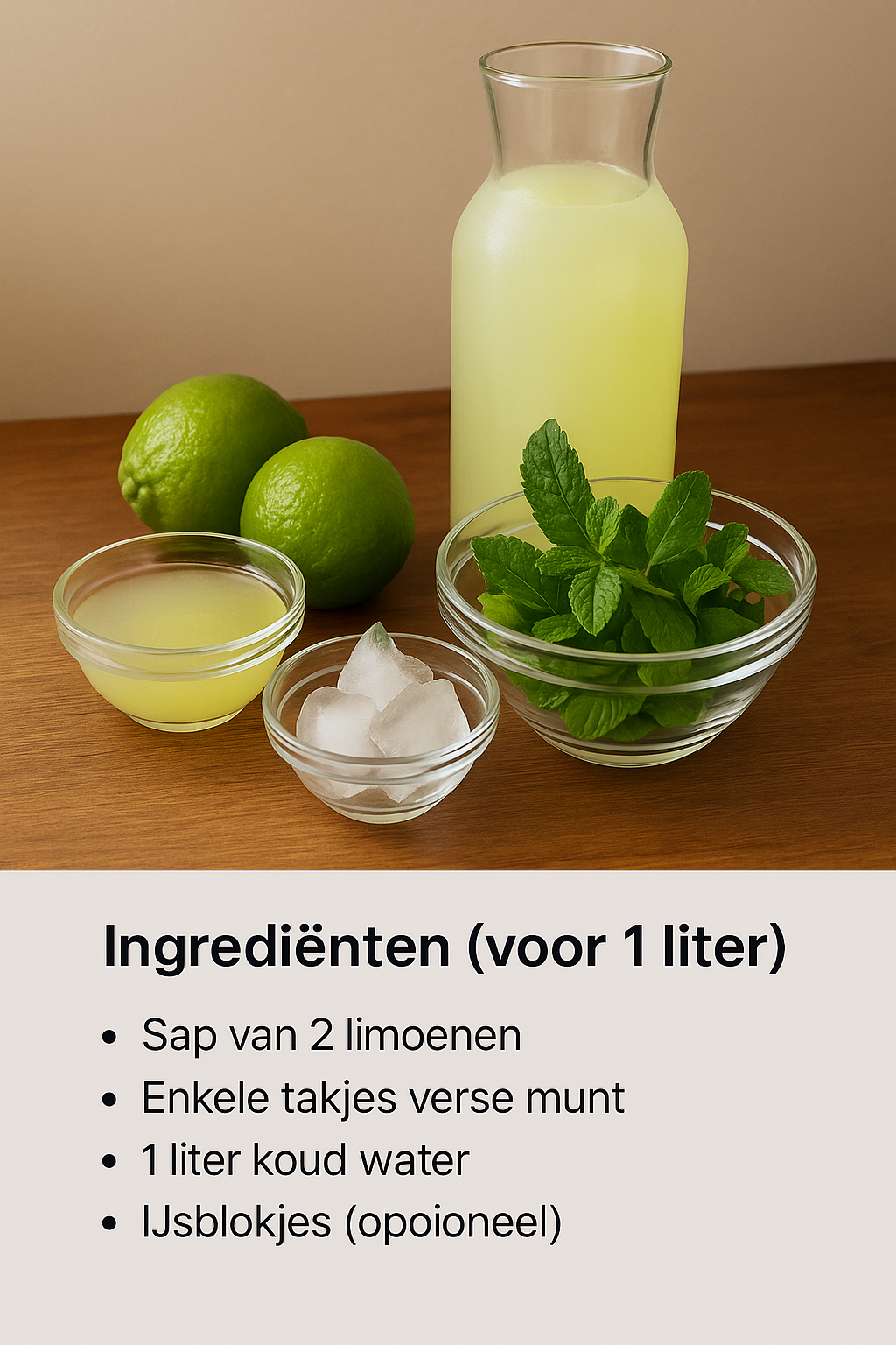 Dit gerecht brengt pure vitaliteit naar uw glas – eenvoudig genoeg om binnen 5 minuten klaar te staan, maar krachtig genoeg om indruk te maken op uw lichaam. Of u nu iets zoekt om mee te beginnen aan een detoxdag of gewoon wilt investeren in duurzaam welzijn – munt-limoenwater wordt uw nieuwe dagelijkse traktatie!