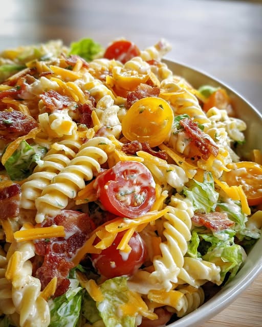 Pastasallad med ranchdressing, bacon, tomater och cheddarost