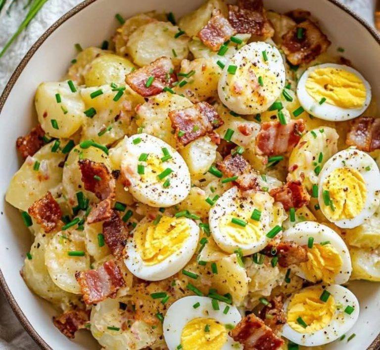 5. Blanda potatis, ägg och bacon i en salladsskål och häll vinägretten över potatisen.